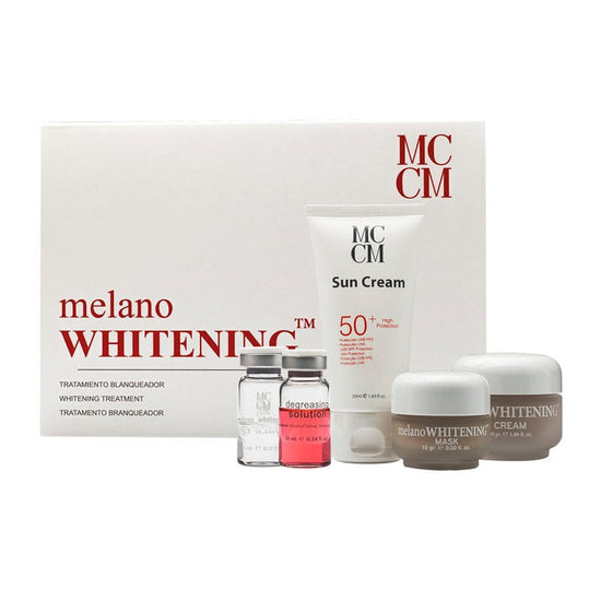 <p>Le Melano Whitening MCCM est un traitement professionnel complet, spécialement formulé pour cibler les problèmes d'hyperpigmentation. Ce pack inclut plusieurs produits : une solution de prétraitement, un flacon de blanchissement par mésothérapie, un masque blanchissant et une crème blanchissante, ainsi qu'une crème solaire pour une protection optimale contre les rayons UV. Grâce à une combinaison d'ingrédients éclaircissants, ce pack permet d'atténuer les taches sombres et de uniformiser le teint. Chaque produit fait partie d'un protocole global qui assure une efficacité maximale tout en préservant la santé de l'épiderme. En luttant contre la surproduction de mélanine, Melano Whitening aide à redonner un éclat naturel à la peau et à la rendre visiblement plus lisse et revigorée.</p>