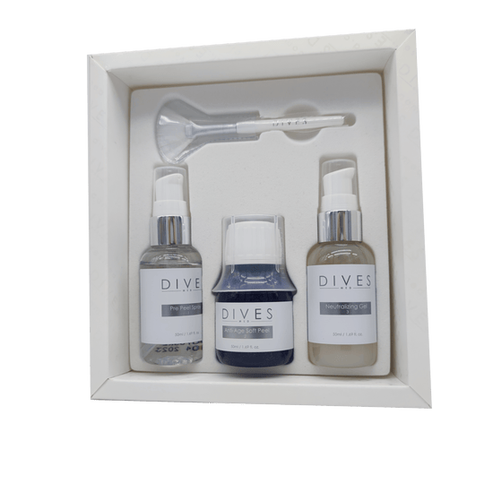 O Kit Peeling Anti-idade Suave - Dives é especialmente concebido para peles sensíveis que desejam beneficiar de um tratamento esfoliante sem irritação. Graças à sua fórmula suave à base de aminoácidos e ingredientes naturais, este peeling estimula a autorreparação da pele, ao mesmo tempo que oferece uma esfoliação superficial. Trata-se de uma solução eficaz para rejuvenescer e preparar a pele para outros tratamentos, garantindo assim um tom fresco e radiante.